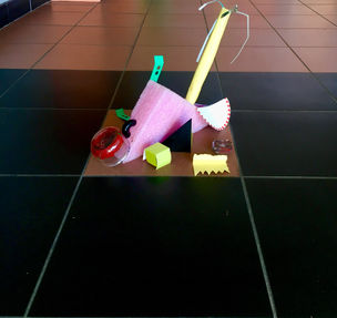 En faisant appel au numérique (QR code sur la boite), je permets au regardeur d’intervenir en QR codant la boite et ainsi créer un déplacement physique. Il est alors actif et non plus passif. Le QR code comporte une notice de réinstallation. Les intervenants sont donc amenés à participer à la mise en forme d'un nouvel état de l'installation en réutilisant les objets dans la boite puis à les remettre dedans et ainsi activer un cycle continu. Le numérique étant omniprésent dans le monde actuel, permet de maintenir l'acteur dans le présent.